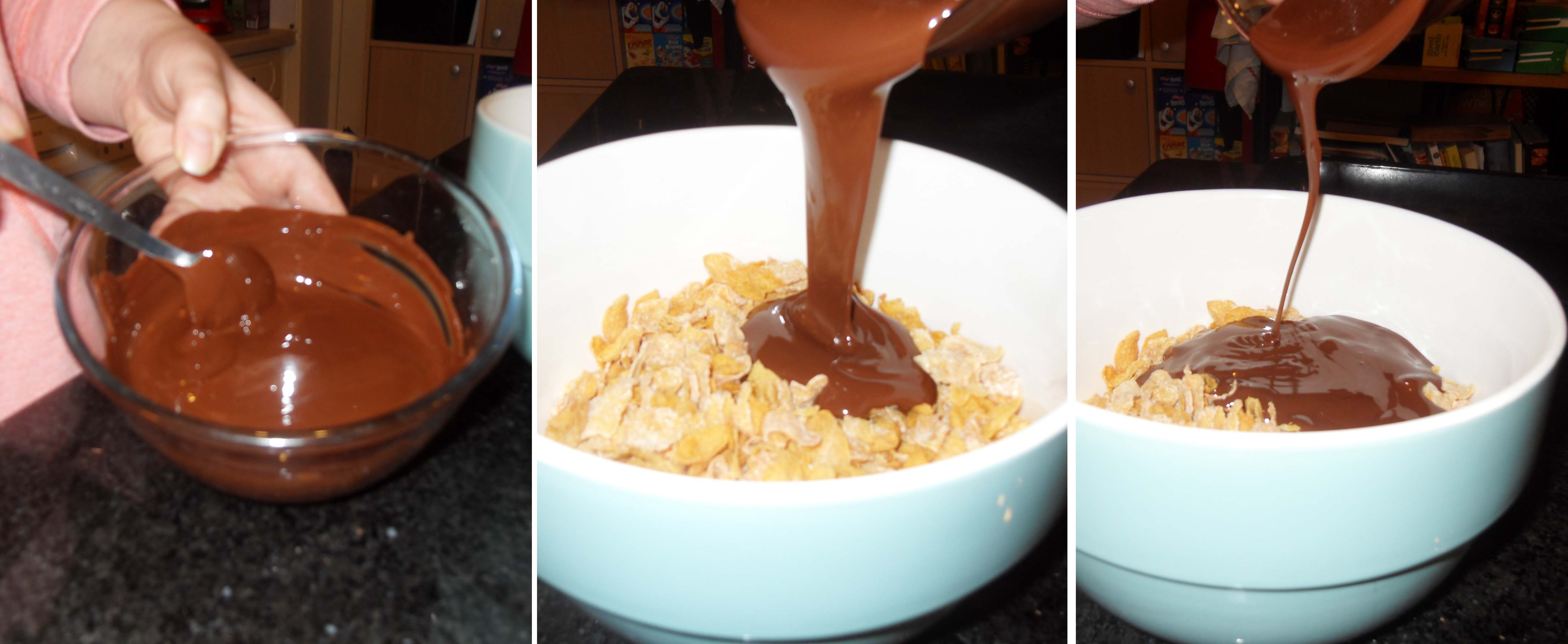 Now comes the technical challenge, you have to pour ALL the melted chocolate over the Frosties without spilling any on the work top, or down the outside of the mixing bowl, a steady hand here is a must.